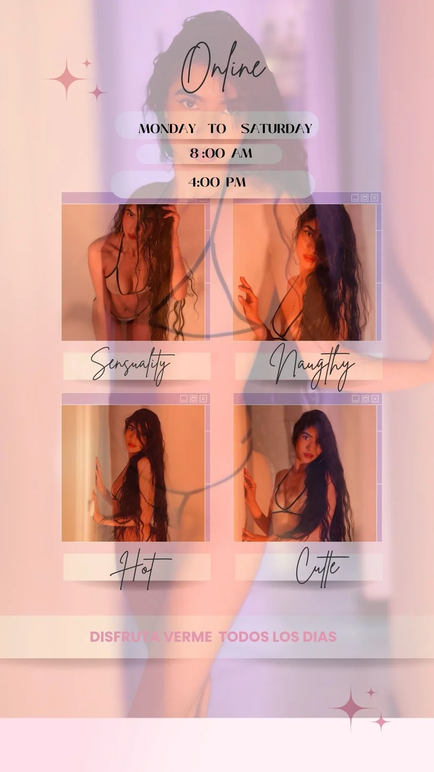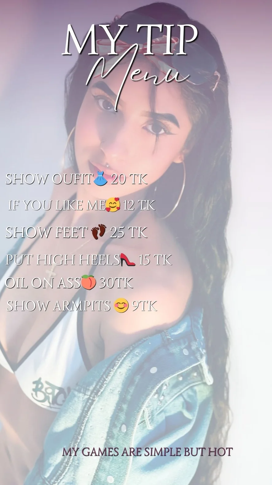 وضعية الكلب, أهيجاو, صفع, رقص مثير, تصبيع, رقص التعري, لعب الأدوار, ألعاب جنسية, مص, نيك الصدر, كعوب عالية, صدر عارٍ, قضيب صناعي أو هزاز, فتيشية القدم, حلق عميق, العادة السرية, فاضح جدًا, عرض زيت, نشوة